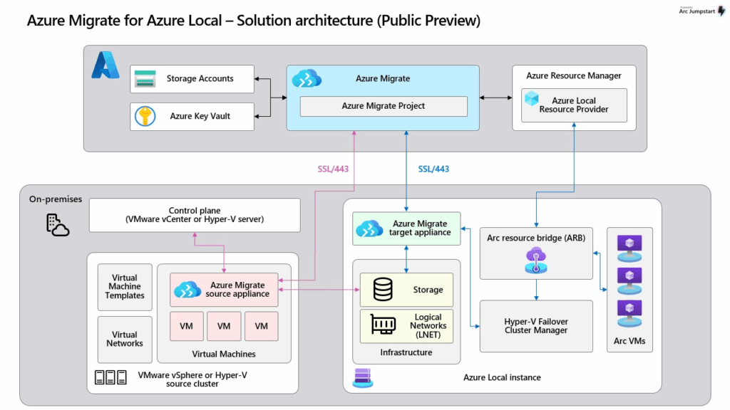 - Keeps the data flow local, from on-premises VMware source servers to Azure Local.