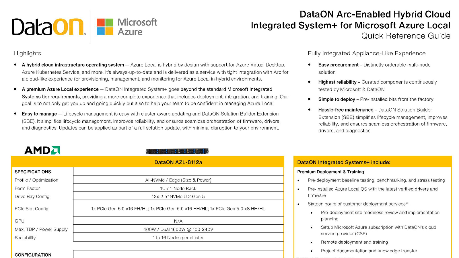 DataON Integrated Systems+ are powered by AMD EPYC™ 9005 Processors, combining AMD technology with Azure Arc-enabled Azure Local. Microsoft and AMD have worked closely together to optimize the features and performance of Azure Local, providing a fast path to hybrid cloud deployment and data center infrastructure modernization.